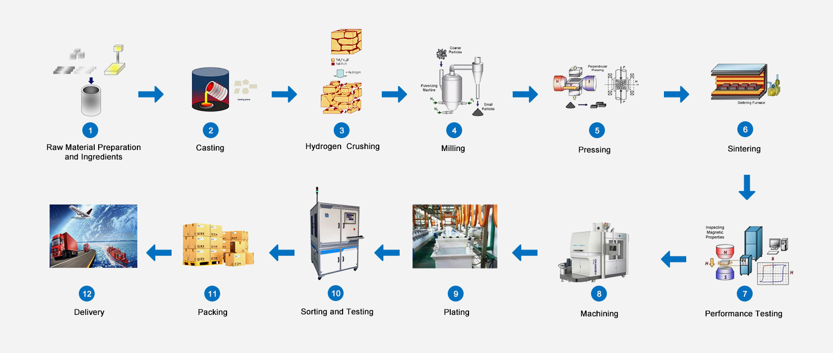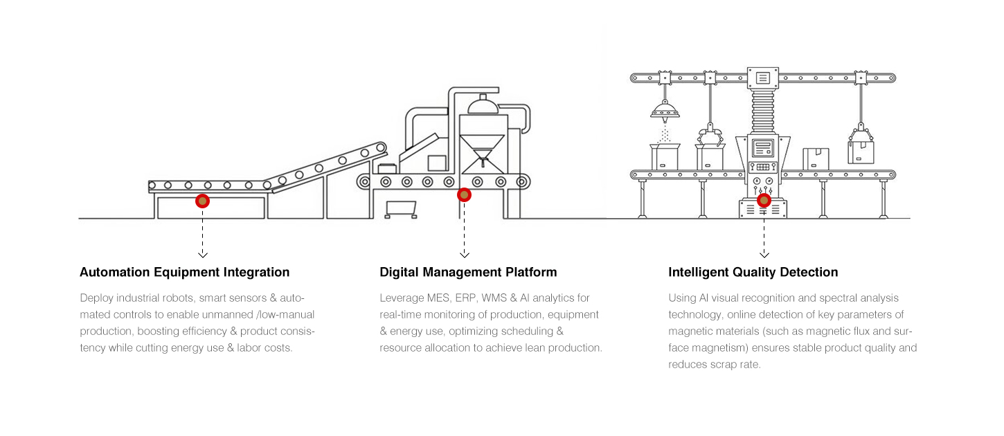 Jinlun Magnet, IATF16949 ve ISO9001/14001 gibi uluslararası sistemler tarafından sertifikalandırılmış akıllı üretim sistemi ve ERP, MES ve WMS gibi sistem yazılımlarıyla bir araya gelerek, hammaddeden bitmiş ürünlere kadar tam süreç kalite izlenebilirliği elde ettik. Ürün kalitesini sağlarken, süreç inovasyonu yoluyla üretim maliyetlerini düşürmeye devam ediyoruz ve müşterilerimize endüstri standartlarının üzerinde, uygun maliyetli çözümler sunuyoruz.